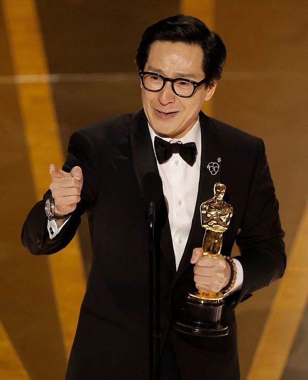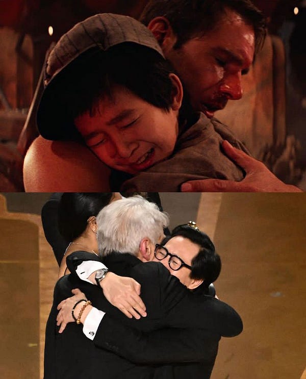 Şeýle-de şol aktýor dabaranyň ahyrynda iň gowy film baýragyny yglan eden Harrison Ford bilen mundan 39 ýyl öň Indiana Jones filmindäki ýaly begençli gujaklaşmagy boldy (çepdäki surat). Ke Jonatan Kwan 1984-nji ýylda Indiana Jones filminde juda gysgajyk keşpde surata düşüpdi. Şonda-da Harrison Fordy gujaklapdy. Ol bu baýragy alanda-da halypa aktýory tolgundyryjy ýagdaýda gujaklady.